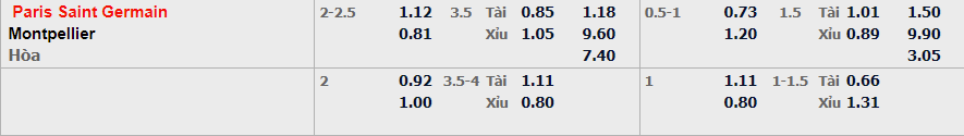 - Mức kèo nhà cái cược chấp trận này: Paris SG chấp 2,25 Trái. Paris SG ăn 1,12. Montpellier ăn 0,81